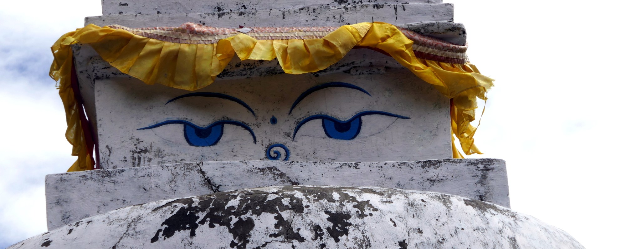 The trail after the river goes up to the town of Pangboche. On the way we see a beautiful buddhist stupa with Ama Dablam in the background. Again, clouds are covering Ama Dablam in the background. I can tell with certainty that this would be a great photo spot on a clear day without clouds covering the mountains behind. The header image on this page is a close-up image of the Buddha’s eyes from this Stupa.