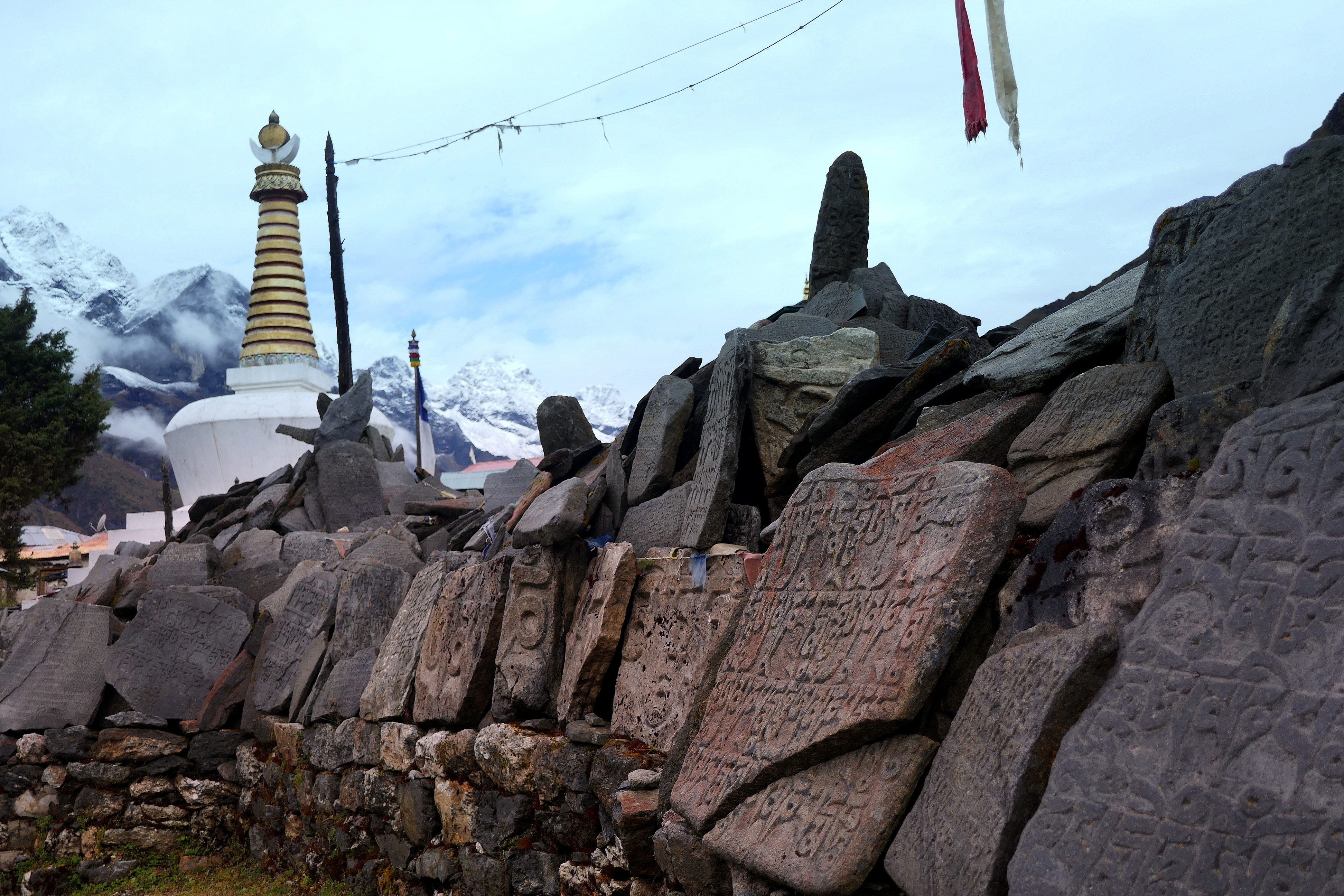 Between our hotel and the monastery, there was trail junction made up of buddhist mantra tablets, with directional sign pointing to Namche Bazaar. Our trail started from here going between our hotel and the monastery.